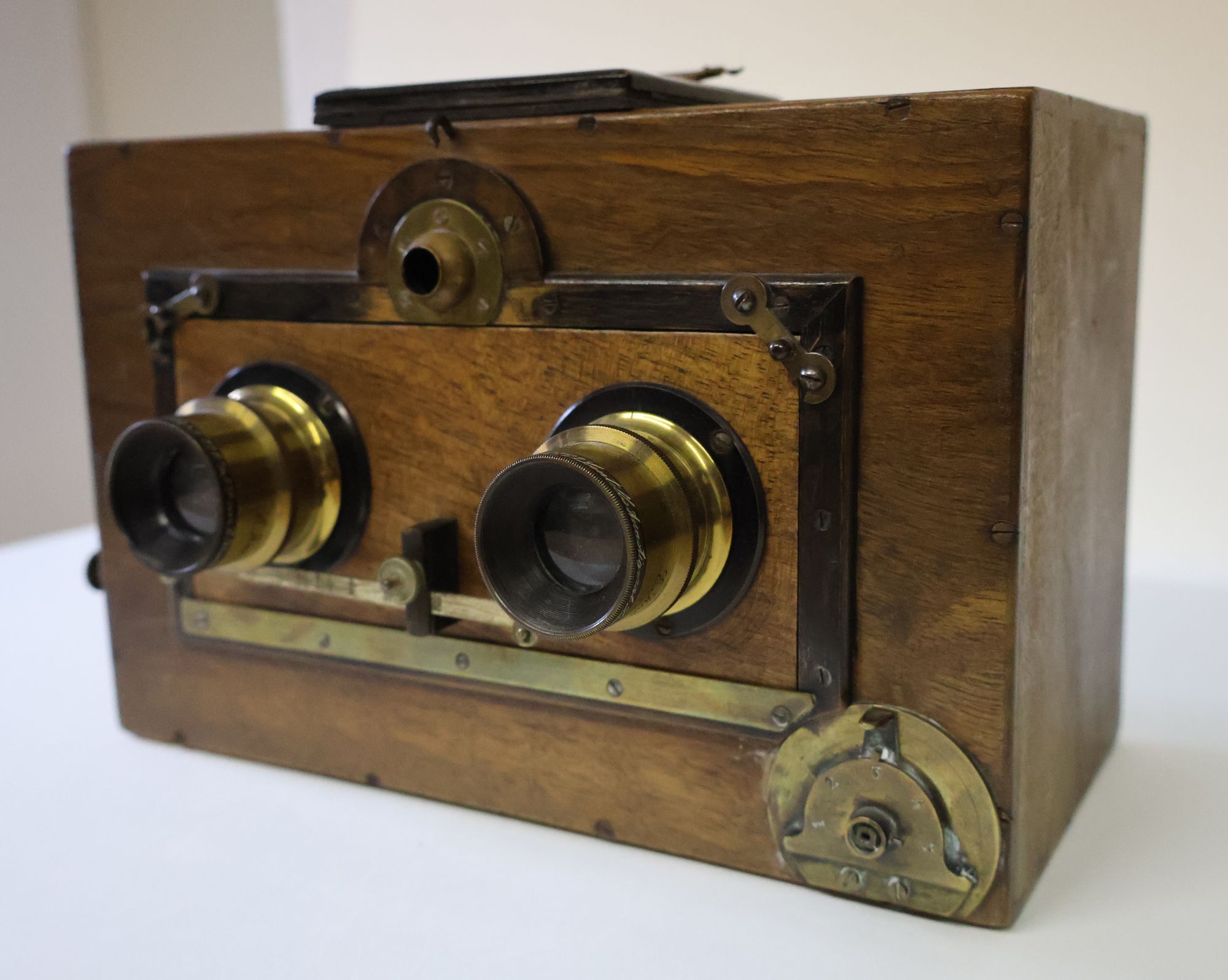 Appliquée à la photographie à partir de 1844, la stéréoscopie connaît son âge d’or entre 1851 et 1880. Son procédé complexe, réalisé grâce à l’émulsion photographique, ne s’opère alors que part des photographes professionnels qui commandent leur matériel chez des ébénistes et des opticiens. L’opticien Emile Français est l’un de ces fabricants. Son kinégraphe, basé sur un brevet français daté du 24 janvier 1887, était une boite presque cubique en bois poli et muni d’un petit objectif visée placé au-dessus de l’objectif principal. S’il n’est pas un véritable reflex à deux objectif, un miroir et un dépoli donne une visée reflex. Le mécanisme de mise au point de l’objectif de visée n’est pas couplé avec celui de l’objectif principal.