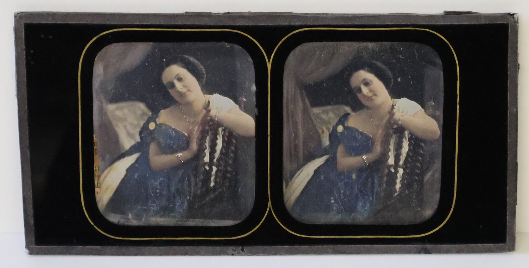 Ce rare daguerréotype stéréoscopique est colorisé à la main par application de pigments colorés. Si l'essentiel de la production photographique reste monochrome jusqu'au milieu du XXe siècle, cette pièce atteste des tentatives des daguerréotypistes du XIXe siècle de rendre leur travail encore plus réaliste par l’apport de la couleur. Cette dernière permet notamment de rehausser les pommettes, habits et bijoux des portraiturés. Ici, ce portrait intimiste présente une jeune femme dans son intérieur, assise sur une chaise les mains sur le dossier. Le daguerréotype est présenté dans son écrin d'origine, verre peint noir à biseau doré, filet doré.